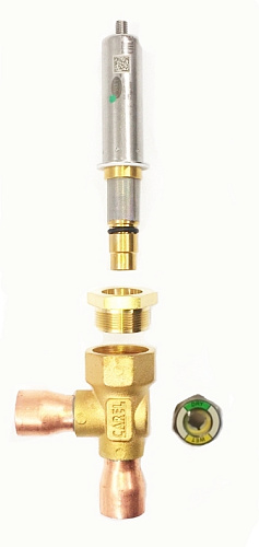 Конструкция включает узкое проходное сечение и интегрированное жиклерное отверстие, обеспечивающее требуемую модуляцию расхода хладагента, а также смотровое стекло для визуальной инспекции потока хладагента в линии. Отсутствие в комплекте статора указывает на модульную конструкцию исполнительного узла, где механическая часть клапана объединена с отдельным электромагнитным/электродвигательным модулем; монтаж производится методом пайки к трубопроводам ODF, что определяет требования к подготовке соединений и монтажным процедурам.