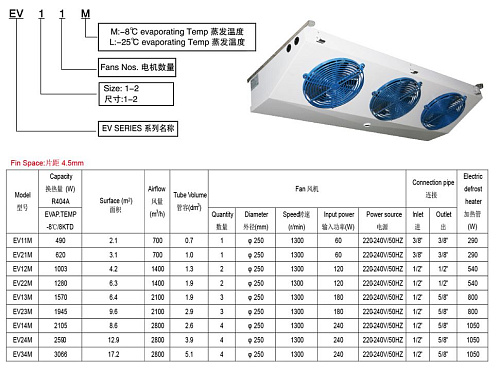 Воздухоохладитель T-COOL EV23M, 4,5 мм, 3*250 мм, 1.94 кВт (-8/delta8), электрооттайка