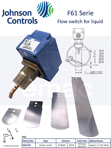 Реле протока Johnson Controls F61SB-9100 представляет собой датчик для контроля наличия и уровня потока жидкостей в трубопроводах; прибор обеспечивает срабатывание при объемных расходах в интервале от 0,15 до 46 дм3/с и имеет степень защиты корпуса IP43, что определяет его устойчивость к попаданию частиц размером более 1 мм и к струям воды, направленным под углом до 60° от вертикали.