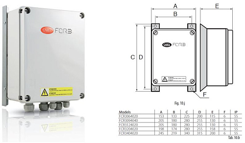Регулятор серии FCR производства CAREL предназначен для управления скоростью вращения трехфазных вентиляторных двигателей; питание осуществляется от трехфазной сети с номинальным напряжением 400 В, устройство рассчитано на непрерывный рабочий ток до 9 А и рассчитано на эксплуатацию в диапазоне температур окружающей среды от −20 до +50 °C.
