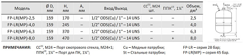 Вертикальный ресивер для хладагента Frigopoint FP-LR-2,5 представляет собой аппаратуру для аккумулирования жидкой фазы хладагента с номинальным объёмом 2,5 дм³ и расчётным максимальным рабочим давлением 28 бар; предназначен для установки в линии после конденсатора с целью создания запаса хладагента и стабилизации его подачи в испарительные блоки. Входное соединение выполнено резьбовым под 1‑дюймовую резьбу стандарта 14 UNS, выход/подсоединение для пайки — ODS под 1/2‑дюймовую трубку, что обеспечивает совместимость с типовыми монтажными схемами холодильно‑трубопроводов.