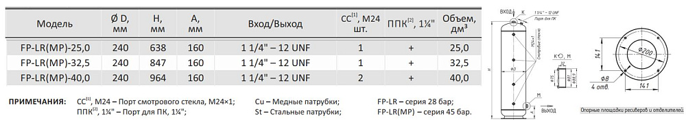 Вертикальный ресивер хладагента FP-LR-32,5 производства Frigopoint имеет полезный объём 32,5 дм³ и рассчитан на максимальное рабочее давление 28 бар; для подключения предусмотрён резьбовой вход 1 1/4" - 12 UNF.