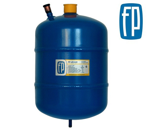 Вертикальный ресивер хладагента Frigopoint FP-LR(MP)-6,3 представляет собой сосуд для аккумулирования и хранения жидкого хладагента с полезным объёмом 6,3 дм3; конструкция рассчитана на эксплуатацию при максимальном рабочем давлении до 45 бар, что определяет область применения в системах средне- и высоконапорной холодильной техники.