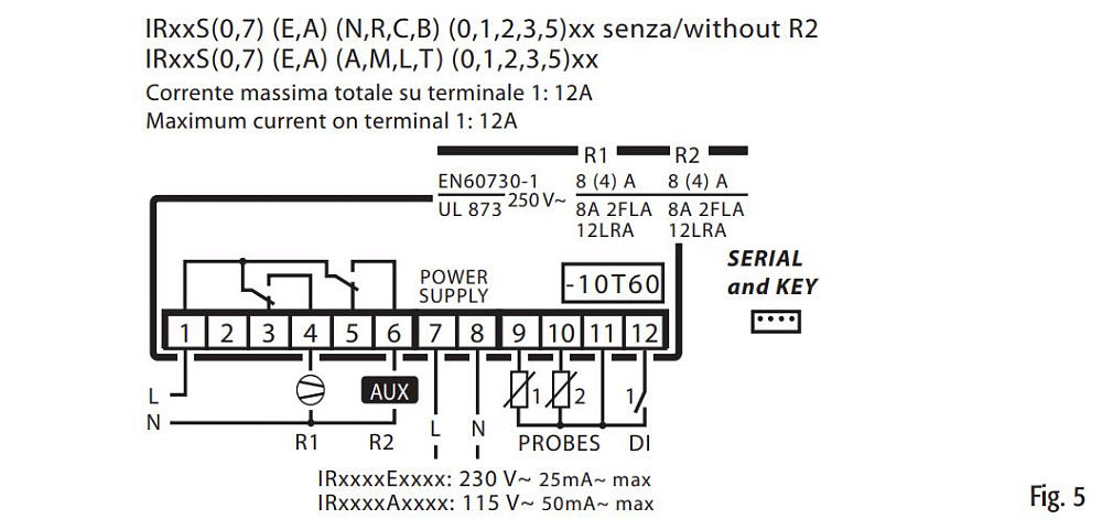 Контроллер CAREL серии IR33 рассчитан на питание от сети переменного тока 230 В и обеспечивает управление с применением двух входных температурных датчиков NTC, один цифровой вход для мониторинга внешних сигналов и звуковое оповещение аварийных состояний встроенным зуммером. Выходная часть реализована двумя электромеханическими реле с коммутационной способностью по переменному току порядка 8 ампер каждое, что определяет допустимые типы исполнительных нагрузок и схемы переключения.