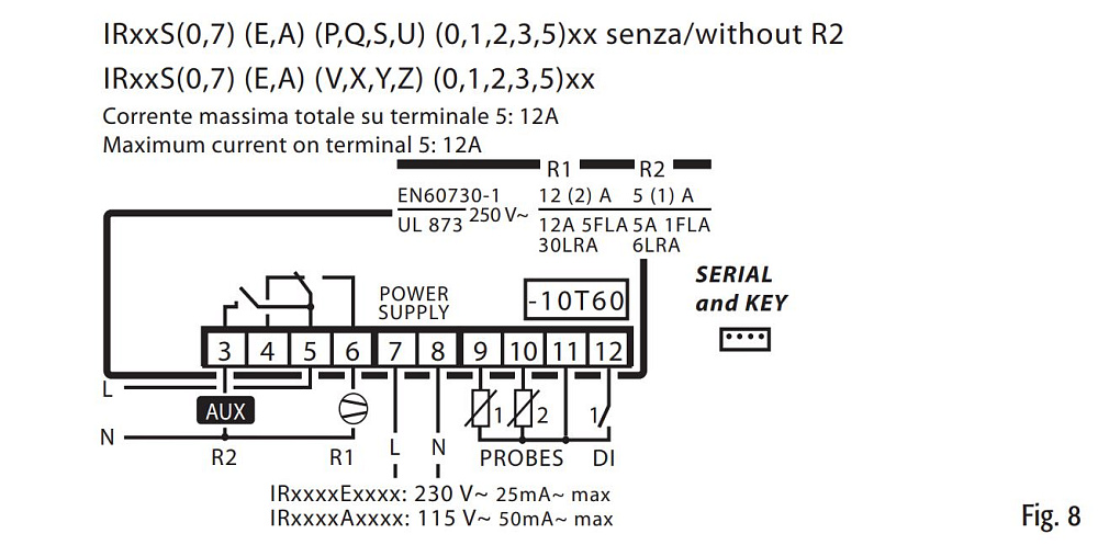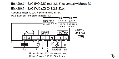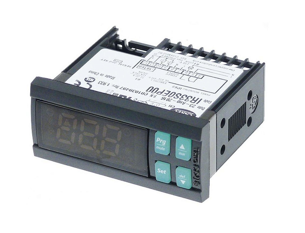Электронный контроллер семейства IR33 (производитель CAREL) предназначен для управления холодильными и климатическими цепями и питается от сети переменного тока 230 В; встроенное электромеханическое реле обеспечивает коммутацию силовой нагрузки до 16 А. Устройство принимает сигналы от двух термисторных датчиков NTC для измерения температуры и имеет один цифровой вход для внешних импульсных или дискретных сигналов; аудиосигнализация реализована с помощью встроенного зуммера. На передней панели расположен трехзначный светодиодный индикатор с пиктограммами состояния; предусмотрена возможность подключения дополнительного внешнего индикатора через соответствующий интерфейс для отображения данных третьего датчика.