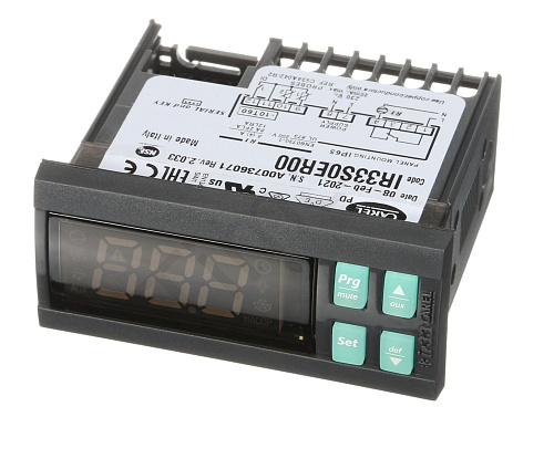 Контроллер CAREL семейства IR33 выполнен для панельной установки и рассчитан на питание 230 Vac; устройство оснащено встроенным электромеханическим реле для коммутации нагрузок до 8 А, одним цифровым входом и поддержкой двух NTC-датчиков температуры, также предусмотрен встроенный звуковой сигнализатор.