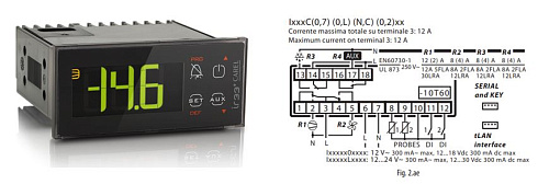 Конструкция контроллера выполнена для монтажной установки в панель, электрические подключения реализованы через винтовые клеммные зажимы, обеспечивающие надежный контакт при промышленной эксплуатации. Логика управления и выходные релейные группы ориентированы на управление холодильными и вспомогательными цепями; предусмотрена возможность расширения индикации — подключение дополнительного внешнего дисплея через совместимый интерфейс для отображения данных третьего датчика.