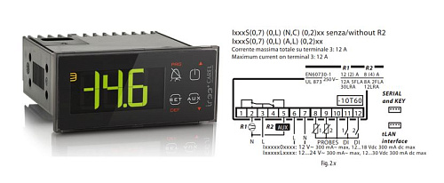 Контроллер питанияется переменным напряжением в диапазоне 12–24 В и содержит встроенное коммутационное реле, рассчитанное на переключение нагрузок порядка 16 ампер, что определяет его способность непосредственно управлять исполнительными цепями холодильного и климатического оборудования. Устройство обеспечивает измерение температуры через два входа для NTC-датчиков и имеет два дискретных входа для внешних сигналов, а также встроенный звуковой оповещатель для локальной индикации аварийных состояний.