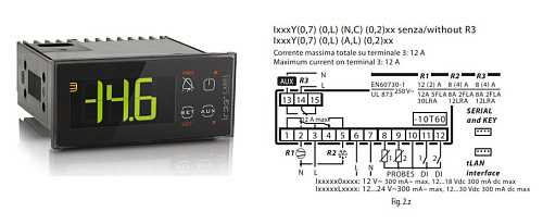 Контроллер семейства IR33+ производства CAREL предназначен для управления холодильными и климатическими цепями при питании низковольтной сетью переменного тока в диапазоне 12–24 В; выходное электромеханическое реле рассчитано на коммутацию нагрузок с током до 8 А и допускает подключение двигателей мощностью до примерно 2 л.с. Устройство имеет два входа для NTC-датчиков температуры и два цифровых входа общего назначения, а также встроенный звуковой сигнализатор для формирования аварийных и информационных сигналов.