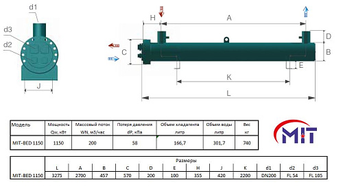 Испаритель кожухотрубный двухконтурный MIT-BED 1150 производства EKIN/MIT рассчитан на работу с хладагентом R407C и при принятых расчетных условиях (испарение около +2 °C и перепад температуры теплоносителя 5 K) обеспечивает холодопроизводительность порядка 1150 кВт. Расчетная пропускная способность по воде составляет 200 м3/ч, при этом внутренний объем межтрубного пространства для воды составляет 301,7 дм3, а емкость по хладагенту — 166,7 дм3; при номинальном расходе воды потери давления в межтрубном контуре составляют порядка 58 кПа.