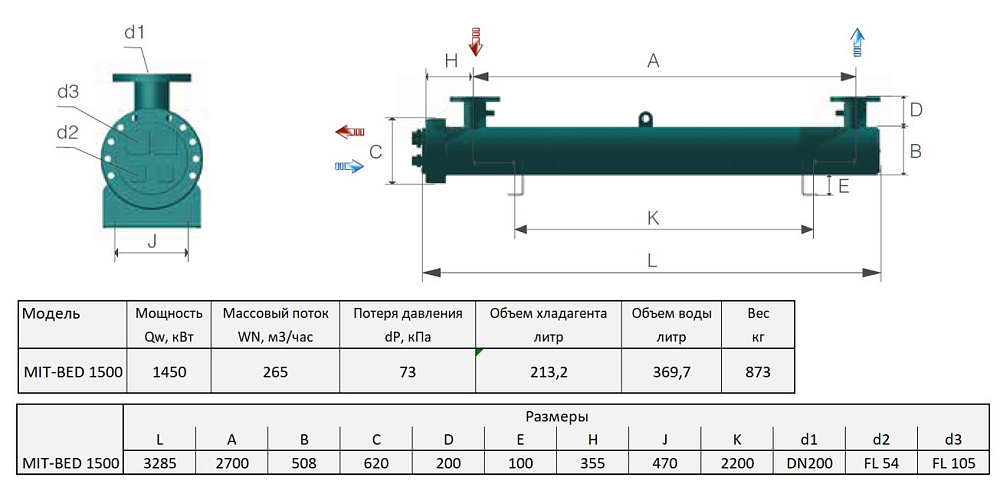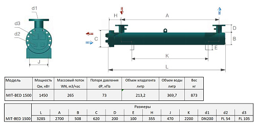 Испаритель MIT-BED 1500 производства EKIN / MIT рассчитан на работу с хладагентом R407C и имеет номинальную холодопроизводительность 1450 кВт при условиях испытания с испарительной температурой около +2 °C и температурой воды на входе/выходе порядка +12/+7 °C; расчетная пропускная способность по воде составляет 265 м³/ч, что при указанной теплопроизводительности соответствует ориентировочному температурному перепаду воды ≈4,7 °C. Внутренние объёмы аппарата составляют примерно 369,7 дм³ по воде и 213,2 дм³ по хладагенту; потери давления в рабочем потоке воды на номинальной нагрузке — приблизительно 73 кПа, что следует учитывать при расчёте насосной станции и гидравлической интеграции.