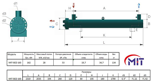 Испаритель кожухотрубный MIT-BED 165 производства EKIN/MIT предназначен для работы с хладагентом R407C и рассчитан на холодильную нагрузку порядка 162 кВт при условиях испарения около +2 °C и температурном перепаде воды примерно 5 K (температуры воды на входе/выходе около +12/+7 °C). Гидравлическая производительность по охлаждаемой жидкости составляет порядка 28 м3/ч, внутренний объем по воде — 34,7 дм3, по хладагенту — 19,7 дм3; тип исполнения — двухконтурный, потери давления в теплообменном канале составляют порядка 53 кПа.