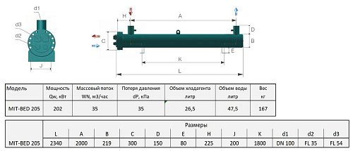 Испаритель кожухотрубный двухконтурный MIT-BED 205 (производитель EKIN / MIT) имеет холодопроизводительность 202 кВт при работе на хладагенте R407C в условиях испытания: температура кипения хладагента около +2 °C, перепад температур по воде по примеру +12/+7 °C. Расход межтрубной воды при этих условиях составляет около 35 м3/ч; объём водяной полости аппарата — 47,5 дм3, объём заправки хладагентом — 26,5 дм3, а потери давления на водной стороне — порядка 35 кПа. Для присоединения воды применены фланцевые патрубки DN100; выводы для хладагента выполнены в виде двух пар фланцевых подключений (FL 35 и FL 54), соответствующих двухконтурной конфигурации.