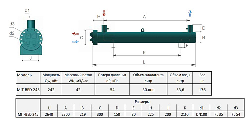 Испаритель кожухотрубный двухконтурный MIT-BED 245 обеспечивает холодопроизводительность 242 кВт при применении хладагента R407C и указанных температурных условиях (испарительная температура примерно +2 °C и температура воды на входе/выходе порядка +12/+7 °C). Гидравлические параметры включают расход воды примерно 42 м3/ч и объем межтрубного пространства около 53,6 дм3; объем заправки хладагента составляет около 30 дм3. Для подбора вспомогательного оборудования важно учитывать суммарные потери давления 54 кПа.