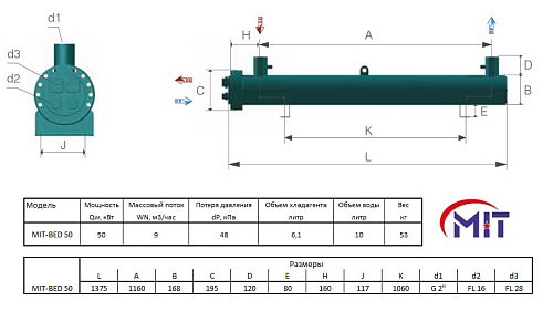 Кожухотрубный испаритель двухконтурного исполнения MIT-BED 50 (производитель EKIN / MIT) обеспечивает холодопроизводительность 50 кВт при работе на хладагенте R407C в режиме с температурой кипения хладагента около +2 °C и перепадом температуры теплоносителя 5 K; расчетные температуры воды на входе и выходе указаны как +12/+7 °C. Расход теплоносителя через аппарат составляет 9 м3/ч, вместимость аппарата по воде — 10 дм3, по хладагенту — 6,1 дм3, гидравлические потери давления равны 48 кПа.