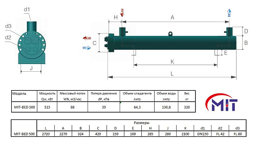 Испаритель кожухотрубный двухконтурный MIT-BED 500 рассчитан на работу с хладагентом R407C и обеспечивает холодопроизводительность порядка 515 кВт при заданной температурной схеме (испарительная температура около +2 °C, температурный перепад 5 K, температура воды в контуре +12/+7 °C). Гидравлические параметры включают расход охлаждаемой воды около 88 м3/ч и потери давления в теплообменнике примерно 39 кПа; объём межтрубного пространства для воды составляет 130,8 дм3, объём хладагента — 64,3 дм3, что важно учитывать при наливе/заправке и балансировке системы.