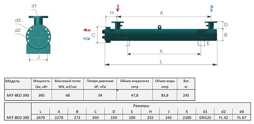 Кожухотрубный испаритель MIT-BED 390 производства EKIN/MIT представляет собой промышленное теплообменное устройство с холодопроизводительностью 395 кВт при использовании хладагента R407C; данное значение получено при типовых рабочих условиях (T0 = +2 °C, перепад температур 5 K, температура теплоносителя на подаче/обратке +12/+7 °C). Гидравлическая производительность соответствует расходу воды около 68 м3/ч, внутренний объём межтрубного пространства по воде составляет 85,9 дм3, а объём хладагента в трубной системе — 47,8 дм3; типовые потери давления на штатном режиме находятся на уровне 34 кПа. Входной и выходной патрубки теплоносителя выполнены под фланцевое соединение DN125, для подключения хладагента предусмотрены по два фланцевых соединения классификации FL 42 и FL 67 для соответствующих контуров.