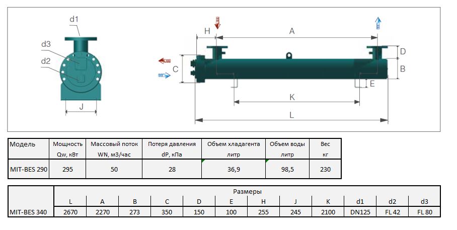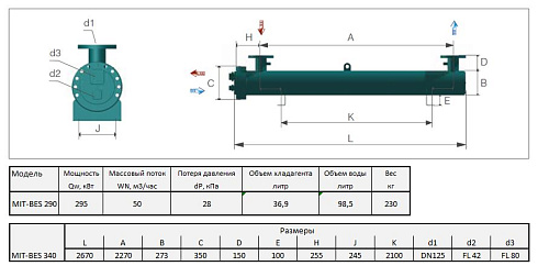 Испаритель кожухотрубный одноконтурный MIT-BES 290 производства EKIN / MIT рассчитан на работу с хладагентом R407C и обеспечивает холодопроизводительность порядка 295 кВт при типовых установочных условиях (испарение около +2 °C и температурной разнице теплоносителя, соответствующей подаче/возврату воды +12/+7 °C). Гидравлическая характеристика устройства предусматривает расход воды около 50 м3/ч при объёме межтрубного пространства 98,5 дм3 и потере давления порядка 28 кПа, ёмкость по хладагента в корпусе испарителя составляет 36,9 дм3.