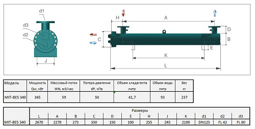 Испаритель кожухотрубный одноконтурный MIT-BES 340 (бренд EKIN / MIT) рассчитан на холодопроизводительность 345 кВт по хладагенту R407C при условиях работы: температура испарения +2 °C, перепад температур теплоносителя 5 K, температура воды на входе/выходе +12/+7 °C. Проектный расход воды составляет 59 м3/ч при объеме межтрубного пространства 93 дм3; объем хладагента в трубном пучке — 41,7 дм3. Уровень гидравлического сопротивления по межтрубному пространству при номинальных условиях — примерно 50 кПа.