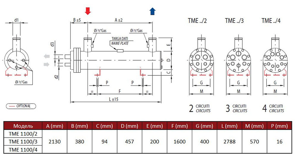 Испаритель кожухотрубного типа Thermokey серии TME рассчитан на холодопроизводительность порядка 1 100 кВт при работе на хладагенте R407C в режиме с испарительной температурой около +2 °C и теплообменом по воде при температурной разнице, соответствующей подаче/возврату +12/+7 °C. Проектная пропускная способность по воде обеспечивает расход порядка 188,8 м3/ч, а внутренние объемы аппарата составляют примерно 245 дм3 для воды и 142 дм3 для хладагента; гидравлическое сопротивление через корпусную часть составляет около 45,4 кПа и должно учитываться при выборе насосного оборудования и систем гидравлической балансировки. Соединения хладагента выполнены с входным и выходным патрубками диаметром соответственно 35 мм и 76 мм, что определяет требования к трубопроводной арматуре и фитингам.