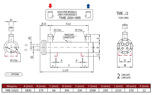 Испаритель Thermokey серии TME (модель TME 135/2) представляет собой кожухотрубный теплообменник, рассчитанный на работу с хладагентом R407C и обеспечивающий холодопроизводительность порядка 135 кВт при условиях испарения около +2 °C и тепловом контуре с подачей/возвратом жидкости +12/+7 °C. Для поддержания заданного теплового режима требуется циркуляция воды порядка 23,2 м3/ч; гидравлические потери на стороне теплоносителя составляют примерно 24,5 кПа. Внутренние ёмкости аппарата — около 36 л для воды и 16 л для хладагента — определяют объём заряда и инерционность системы при пуско‑остановочных режимах.