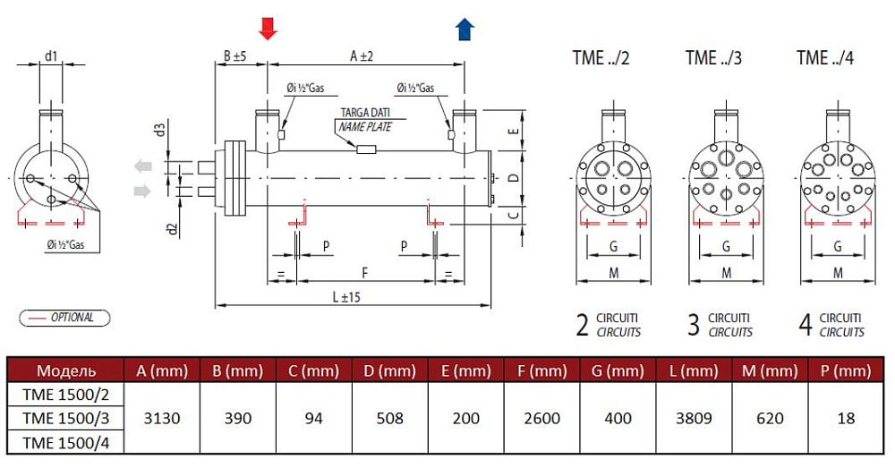 Испаритель кожухотрубный Thermokey серии TME 1500/2 рассчитан на холодопроизводительность 1500 кВт при использовании хладагента R407C и режиме испарения T0 = +2 °C с температурной парой теплоносителя Tw = +12/+7 °C; расчетный расход воды для обеспечиваемой мощности составляет 257,5 м³/ч, внутренний объем для воды — около 437 дм³, для хладагента — около 227 дм³, а гидравлические потери через теплообменник составляют 87,3 кПа, что необходимо учитывать при подборе насосного оборудования и гидравлической схемы; присоединения хладагента выполнены диаметрами вход/выход 64/141 мм.