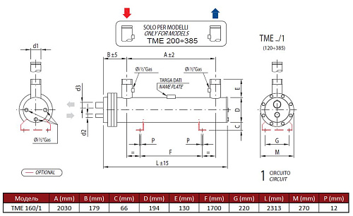 Испаритель кожухотрубный Thermokey TME 160/1 рассчитан на работу с хладагентом R407C при температуре кипения порядка +2 °C и предназначен для поддержания температурного режима теплоносителя с подачей/возвратом порядка +12/+7 °C; номинальная холодопроизводительность при указанных условиях составляет 160 кВт, расход воды через межтрубное пространство около 27,5 м3/ч, падение давления в теплообменнике на стороне воды порядка 30 кПа, объём воды в зоне теплообмена — 39 дм3, объём хладагента в трубном пучке — 19 дм3, модель выполнена для одного холодильного контура с присоединительными патрубками хладагента диаметром вход/выход 35/54 мм.