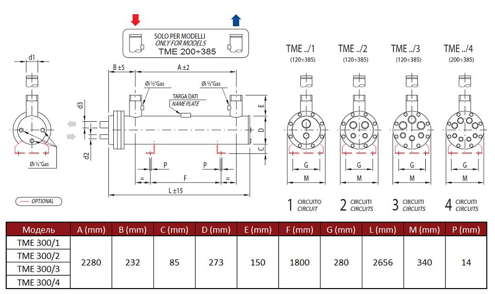 Испаритель кожухотрубный Thermokey серии TME, модель TME 300/3, рассчитан на холодопроизводительность 300 кВт при использовании хладагента R407C при испарительной температуре +2 °C и температурном ходе теплоносителя с +12 °C до +7 °C; при этих параметрах аппарат обеспечивает расход теплоносителя порядка 51,5 м3/ч. Внутренний водяной объем межтрубного пространства составляет 101 дм3, объем хладагента в системе — 35 дм3, а гидравлические потери по воде на рабочем режиме оцениваются в 36 кПа. Патрубки хладагента выполнены с диаметрами входа/выхода 35/42 мм, что определяет требования к присоединительной арматуре и магистральным линиям.