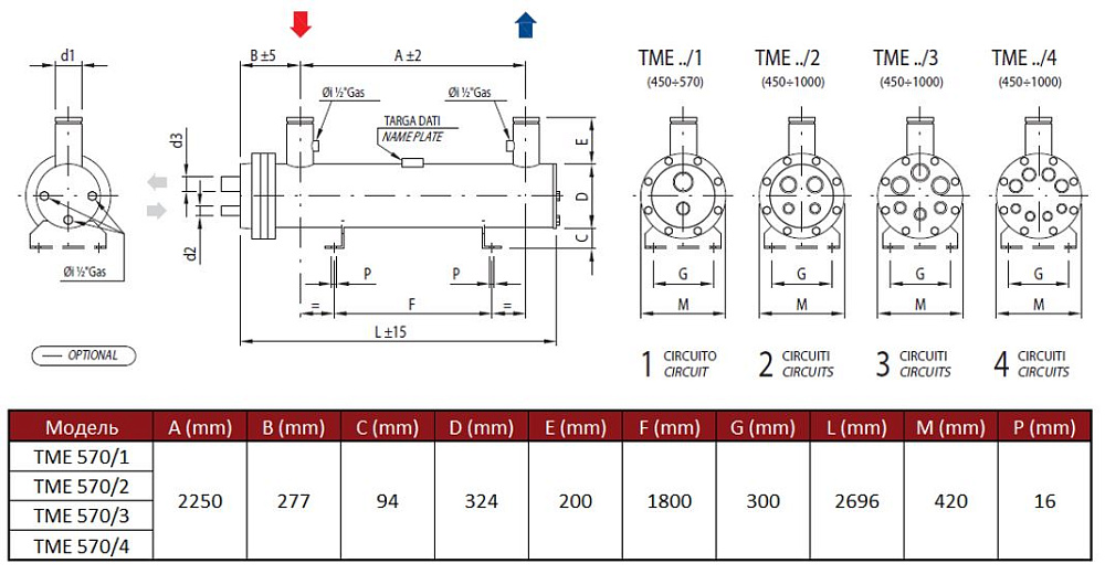 Расчетная холодопроизводительность испарителя серии TME при использовании хладагента R407C и температуре кипения примерно +2 °C с входной/выходной температурой воды около +12/+7 °C составляет 570 кВт; при этой нагрузке расход воды по теплообмену соответствует примерно 97,8 м³/ч, рабочий объём воды внутри аппарата — 116 дм³, объём хладагента в аппарате — 70 дм³, а гидравлические потери по воде — порядка 39 кПа. Патрубки хладагента для подключения к магистралям обозначены как вход/выход 42/89 соответственно.