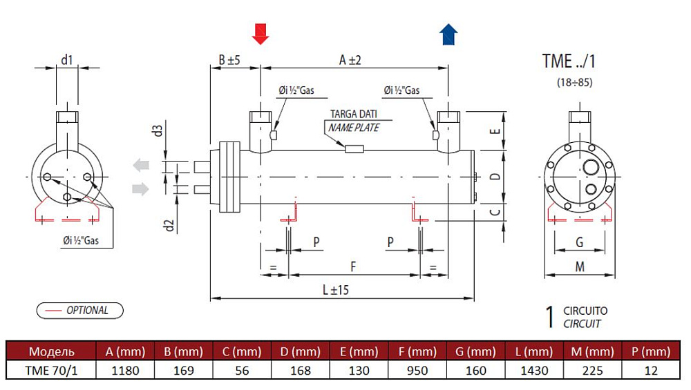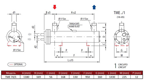 Испаритель кожухотрубный Thermokey серии TME рассчитан на холодопроизводительность 70 кВт при использовании хладагента R407C с температурой кипения около +2 °C и расчетным температурным перепадом теплоносителя 5 K при входной/выходной температурах воды +12/+7 °C. Проектный расход воды через межтрубное пространство составляет 12,0 м3/ч; внутренние объёмы аппарата — 17 дм3 для воды и 9 дм3 для хладагента — имеют значение при расчётах инерционности системы и дозаправке хладагента.