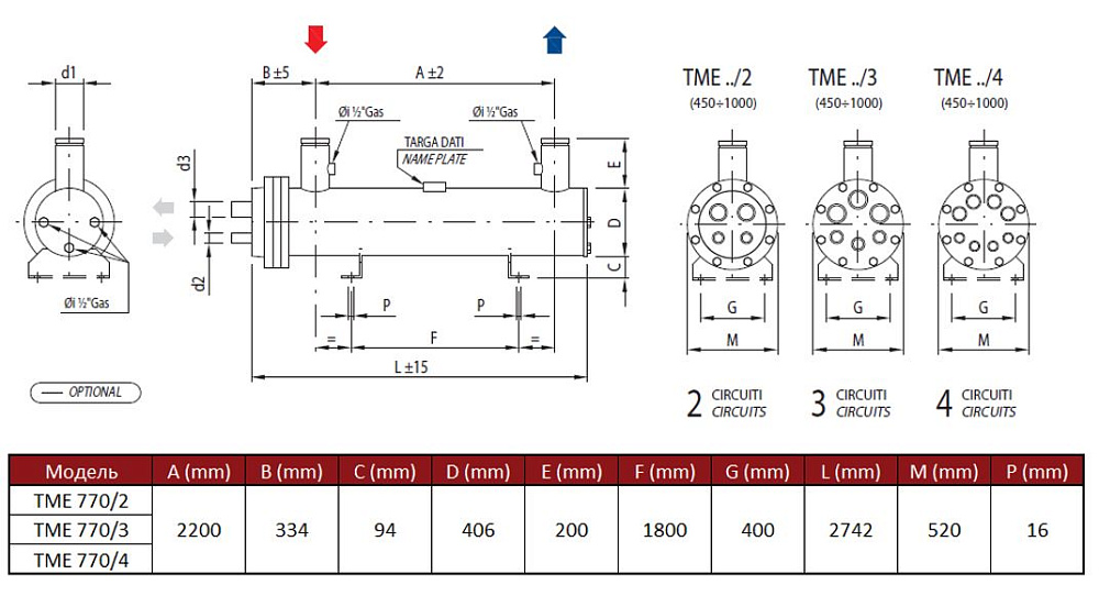 Кожухотрубный испаритель Thermokey серии TME, модификация 770/2, рассчитан на холодопроизводительность 770 кВт при использовании хладагента R407C и рабочих условиях с температурой испарения T0 = +2 °C и температурным уровнем теплоносителя Tw = +12/+7 °C; при этих условиях номинальный расход охлаждаемой воды составляет 132,2 м3/ч, объем межтрубного пространства по воде — 213 дм3, объем хладагента в трубной системе — 91 дм3, а гидравлические потери на водной стороне — 66,9 кПа. Патрубки хладагента выполнены с диаметрами входа и выхода 54 мм и 89 мм соответственно, что определяет требования к магистральным соединениям и фитингам.