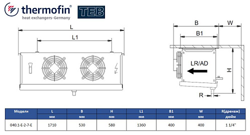 Воздухоохладитель Thermofin серии TEB, 045.1-E-2-7-E, 7 мм, 1*450мм, 20 кВт/ 14,7 кВт (SC2 / SC3)