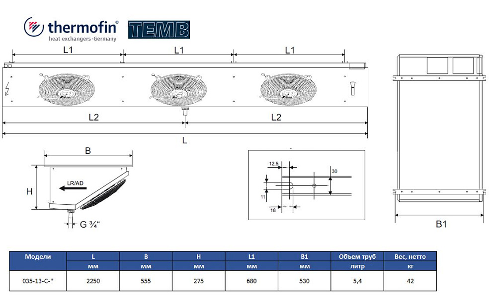 Воздухоохладитель Thermofin серии TEMB.1, 035-13-C-N-W5-04, 4 мм, 3*350мм, 14,1 кВт/ - кВт (SC2 / SC3)