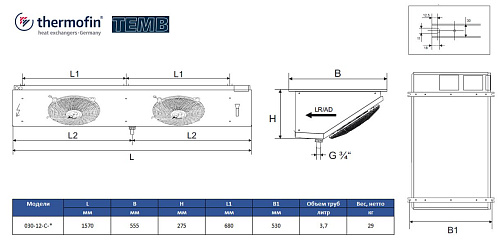 Воздухоохладитель Thermofin серии TEMB.2, 030-12-С-N-WE-07-E, 7 мм, 2*310мм, 5,8 кВт/ 4,3 кВт (SC2 / SC3)