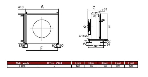 Горизонтальная схема воздушного потока реализована посредством одного осевого вентилятора диаметром 800 мм, обеспечивающего указанную величину расхода воздуха и направленный обдув теплообменного блока; конструкция соответствует исполнению для выносного (наружного) конденсатора и рассчитана на интеграцию в промышленные холодильные цепи по стандарту EN 327.