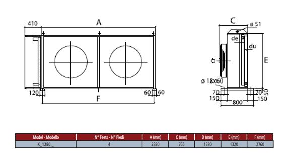 Конструкция выполнена в горизонтальном исполнении воздушного потока с двумя осевыми вентиляторами диаметром 800 мм, размещёнными для формирования направленного потока через секции теплообменника. Патрубки для подключения хладагента имеют диаметры входа/выхода, рассчитанные для интеграции в типовые холодильные магистрали, и обеспечивают требуемые гидравлические показатели при заданном объёме труб. Компоновка учитывает эксплуатацию в качестве выносного конденсатора с обеспечением доступа к обслуживаемым узлам.