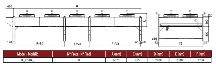 Конструкция представляет собой модульный блок с расположением вентиляторов в конфигурации, соответствующей параметрам EN 327 5×2×800 мм: десять осевых вентиляторов диаметром 800 мм распределены по пять секциям по два вентилятора в каждой для формирования вертикального потока. Теплообменный элемент и вентиляторные блоки собраны в единую компоновку с разграничением входных и выходных патрубков, габаритные присоединения выполнены как две трубные линии Ø76 мм и две Ø42 мм для подключения к магистралям холодильной системы.
