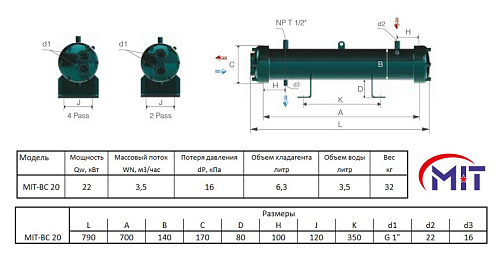 Конденсатор кожухотрубный MIT-BC 20 от производителя EKIN/MIT представляет собой кожухотрубный теплообменник с номинальной холодопроизводительностью порядка 22 кВт при использовании хладагента R407C; параметры испытаний — испарительная температура +2 °C (перегрев ≈5 K), температура воды на входе/выходе теплообменника +12/+7 °C, расчетная температура конденсации около +42 °C. Внутренний объём для воды составляет 3,5 дм3, объём по хладагенту — 6,3 дм3, расчётный расход воды для достижения указанной производительности — 3,5 м3/ч, потери давления по хладагенту через аппарат — порядка 16 кПа.