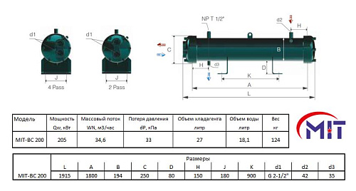 Кожухотрубный конденсатор MIT-BC рассчитан на теплообмен с водой и обеспечивает холодопроизводительность порядка 205 кВт при работе на хладагенте R407C в заданных режимах (конденсационная температура около +42 °C; температурный режим теплоносителя на входе/выходе порядка +28/+33 °C). Расчетный расход воды при номинальной нагрузке составляет 34,6 м3/ч; внутренний объем воды теплообменной секции — 18,1 дм3, объем хладагента в аппарате — 27 дм3. Гидравлическое сопротивление указано на уровне 33 кПа, что отражает дополнительные потери давления при протоке теплоносителя через секцию.