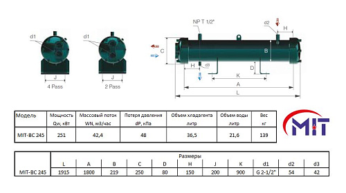 Конденсатор кожухотрубный MIT-BC 245, 251 кВт, R407c, Tk=+42, Tw +28 / +33