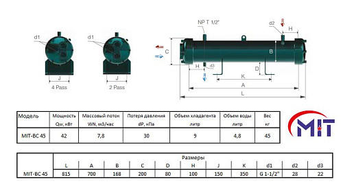Конденсатор кожухотрубный MIT-BC 45, 42 кВт, R407c, Tk=+42, Tw +28 / +33