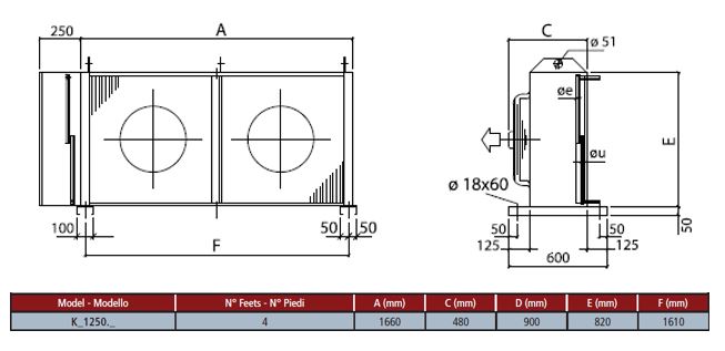 Корпус и компоновка выполнены в горизонтальном исполнении воздушного потока, что определяет расположение вентиляторов и направление движения воздуха через оребренный теплообменник. Два крупных вентилятора обеспечивают равномерный обдув секций теплообменника, а приведённые размеры и конструкция патрубков предусмотрены для интеграции в выносные конденсирующие установки стандартной схемы разводки. Конструкция учитывает требования измерения и сертификации по EN 327.