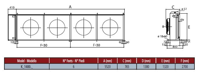 Конструкция выполнена с горизонтальной схемой воздушного потока и включает четырёхвентиляторную секцию с осевыми вентиляторами диаметром 800 мм, обеспечивающими равномерное продувание охладительного блока; патрубки для подсоединения хладагента расположены для внешнего подключения и имеют условные проходы 64 мм (вход) и 42 мм (выход), что упрощает интеграцию в трубопроводы холодильной установки.