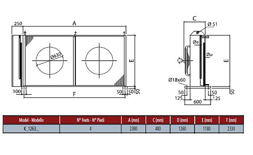 Конструкция выполнена с горизонтальным направлением воздушного потока и оснащена двумя осевыми вентиляторами диаметром 630 мм, обеспечивающими прямой продув теплообменной решётки. Такое исполнение предусматривает выносной монтаж конденсатора относительно машинного помещения и упрощает организацию воздухообмена и обслуживания вентиляторного блока. Корпус и расположение элементов спроектированы с учётом внешней установки и доступа к присоединительным патрубкам.