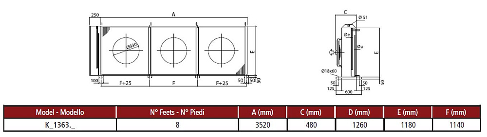 Агрегат выполнен в исполнении с горизонтальным направлением воздушного потока: три осевых вентилятора диаметром 630 мм распределены по длине корпуса для равномерного прогрева теплообменной секции и обеспечения заданного расхода воздуха. Конструкция соответствует конфигурации, обозначенной по EN 327 как трёхмодульная по 630 мм, что влияет на компоновку рам и доступ для обслуживания.