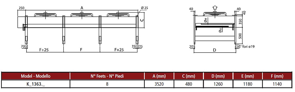 Конструкция выполнена как выносной (наружный) конденсатор с вертикальным направлением воздуха; три одинаковых вентилятора расположены в единой линии и формируют равномерное обдувание теплообменного блока. Расположение и размеры вентиляторов, а также конфигурация трубно-пластинчатого теплообменника соответствуют требованиям EN 327 и рассчитаны на присоединение к типовым промышленным холодильным контурам с указанными диаметрами патрубков.