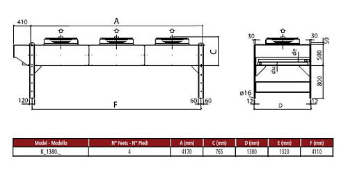 Агрегат выполнен с вертикальным направлением воздушного потока и оснащён тремя вентиляторами диаметром 800 мм, расположенными для организации прохода воздуха сквозь теплообменный блок; конструкция соответствует модульной схеме наружного конденсатора и рассчитана на установку в составе выносных холодильных установок по стандарту EN 327.