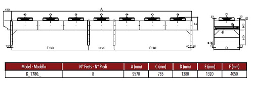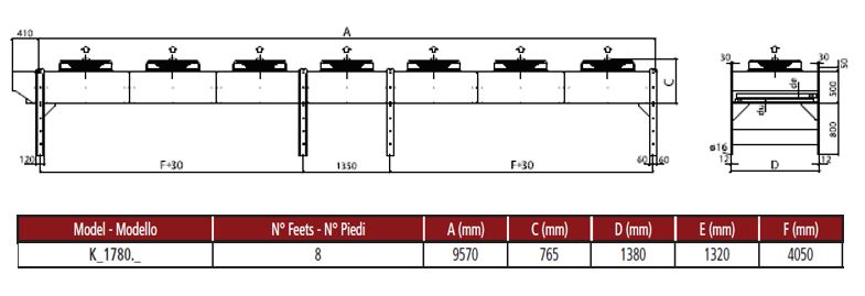Конденсатор Thermokey серии Q KQ 1780.CD V выполнен как внешний воздушный конденсатор для хладагента R404A и рассчитан по методике EN 327 на холодопроизводительность 443,6 кВт при перепаде температур ΔT = 15 K; номинальная способность отвода воздуха обеспечивается суммарным расходом порядка 93 800 м3/ч, а теплопередающая поверхность коилов составляет примерно 1 104 м2 при объёме трубной системы около 188 л; патрубки подключения имеют диаметры вход/выход 76 мм и 54 мм соответственно, акустический уровень на расстоянии 10 м — 48 dBA.