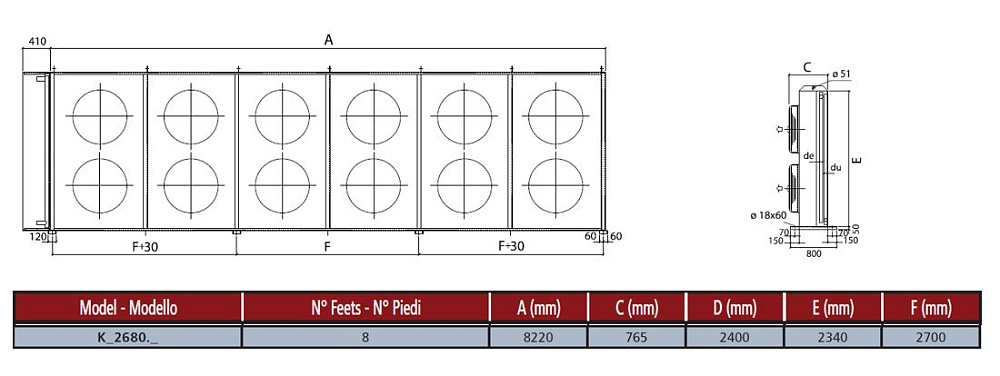 Исполнение устройства выполнено с горизонтальным направлением воздушного потока: тепловая нагрузка отводится через последовательные секции теплообменника, продуваемые группой из двенадцати вентиляторов диаметром 800 мм. Модульная расстановка вентиляторов обеспечивает равномерное распределение воздуха по площади теплообмена и упрощает доступ к узлам для технического обслуживания; компоновка корпуса рассчитана на внешнее (выносное) размещение в составе промышленной холодильной установки.