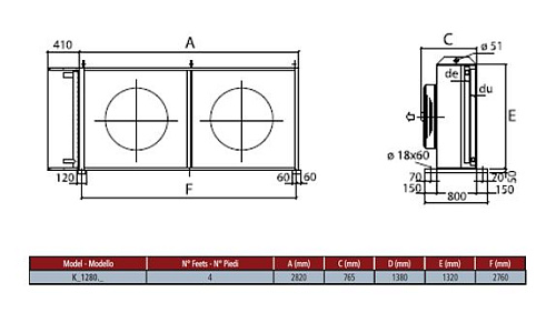 Агрегат выполнен в исполнении с горизонтальным воздушным потоком и использует двухвентиляторную схему с осевыми вентиляторами диаметром 800 мм, обеспечивающую расчётный расход воздуха примерно 20 000 м³/ч; патрубки входа и выхода хладагента диаметром 42 мм и 28 мм рассчитаны на подключение внешней холодильной компрессорно-конденсаторной части.